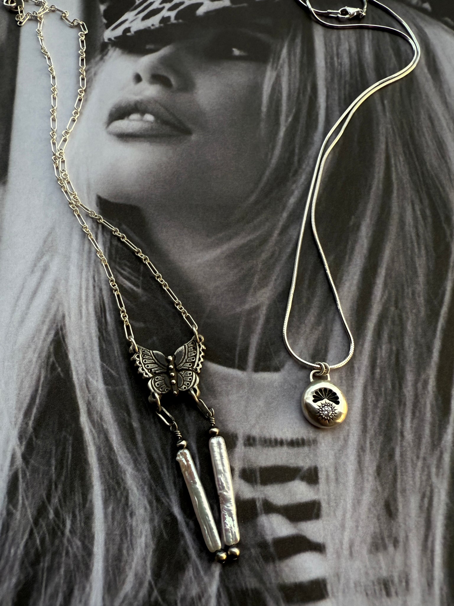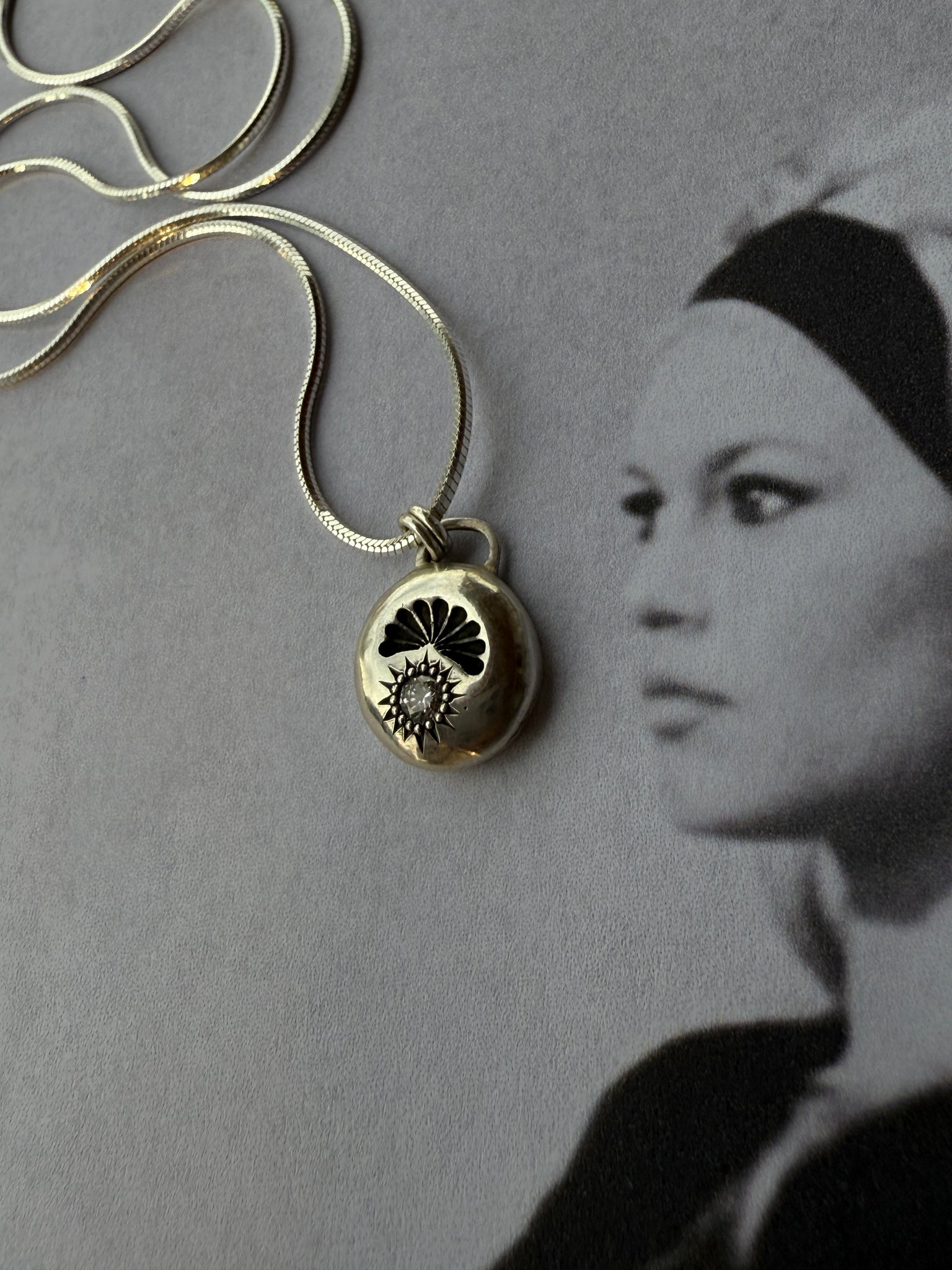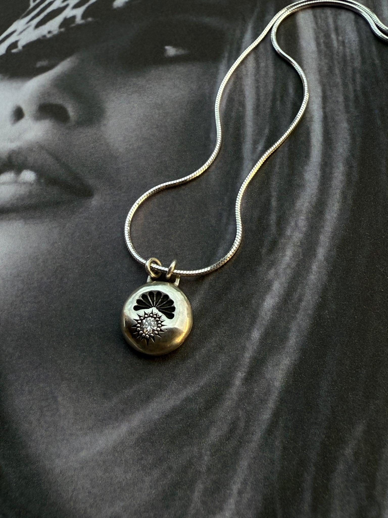 A hand forged and fabricated solid silver pendant, hand stamped set with a 3mm diamond. Hung on a 20 inch solid silver snake chain.