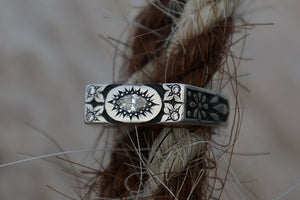 Solid sterling silver ring. Hand engraved and fabricated. Set with a quarter carat lab grown marquise diamond and 4 corner accent round diamonds.
