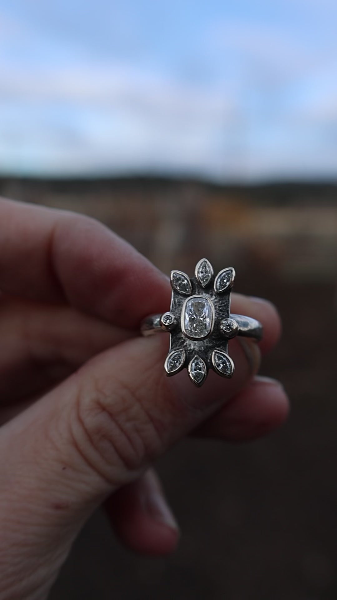 Over a carat of diamonds stacked on this ring in 14k gold. A unique take on a traditional western design. This ring has a small cosmetic flaw that doesn’t affect its function whatsoever. One of the bezels is slightly melted but the diamond is completely secure and is not visible unless you inspect it from the side. A flaw that means it’s handmade :). Price reflects this. (Bezel is the top left corner marquise diamond). Please feel free to email me with any questions. Can be sized up slightly.