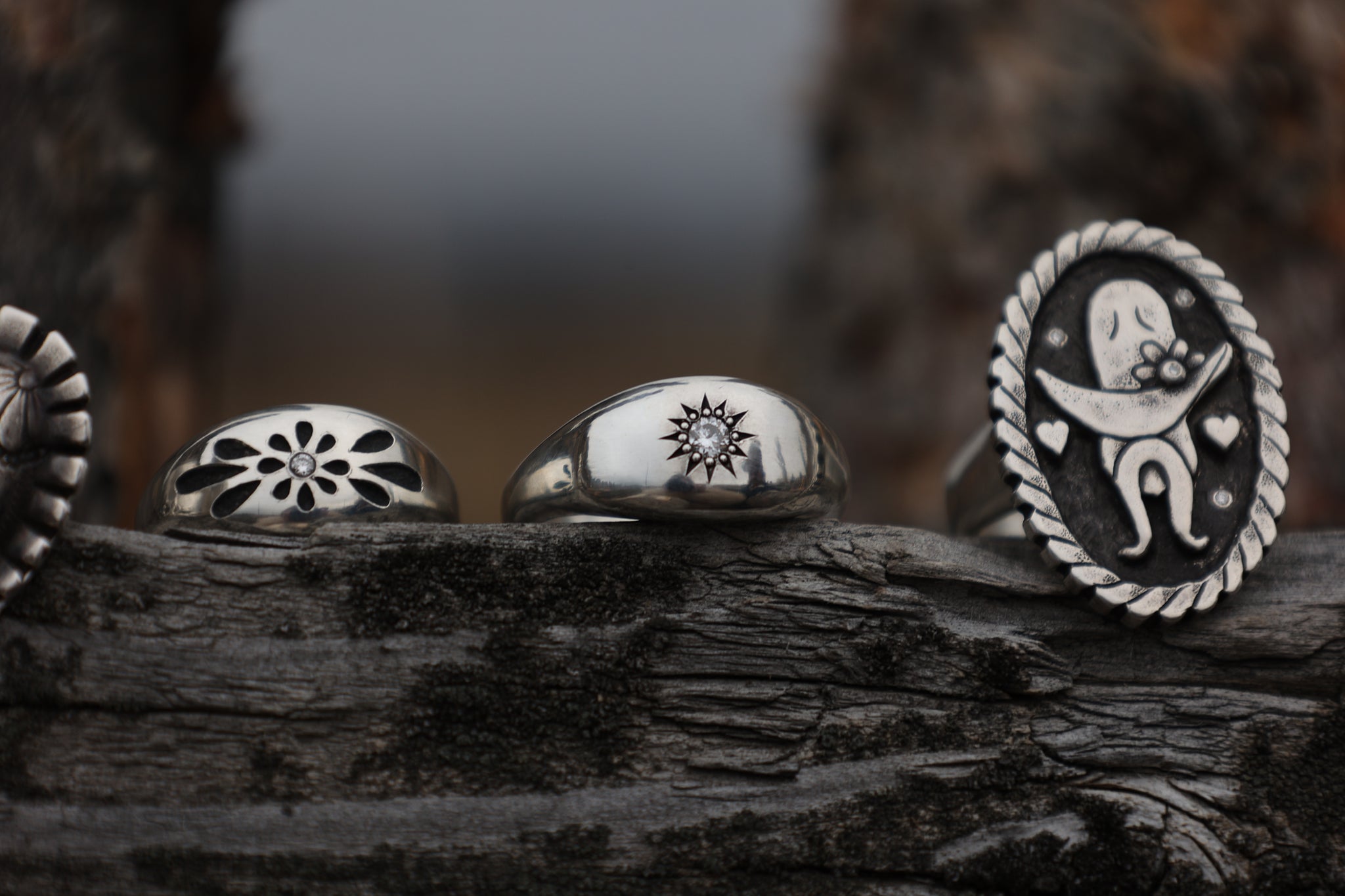 Sterling silver signet ring set with a 3mm diamond. Hand engraved and fabricated.
